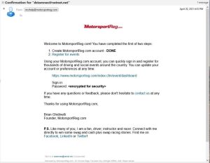 - Look in your email and you should have a Welcome to MotorsportReg email. Click on the link to register for an event and that will complete your account sign-up!